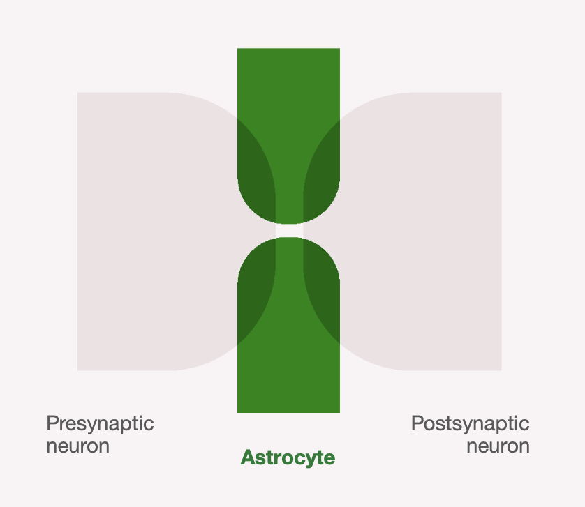 Figure 1: Schematic diagram of the tripartite synapse. Astrocytic processes (green) wrap around most cortical synaptic connections between neurons, allowing astrocytes to integrate the myriad chemical signals sensed in the neuronal chatter, and downstream, to incorporate that information with other signals about the local brain network sensed from other parts of the extracellular space.